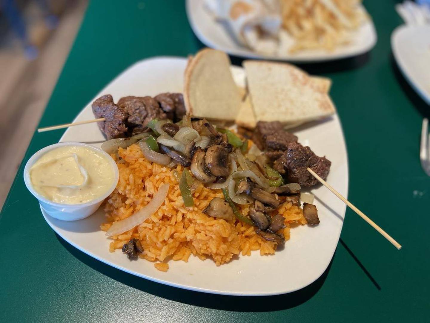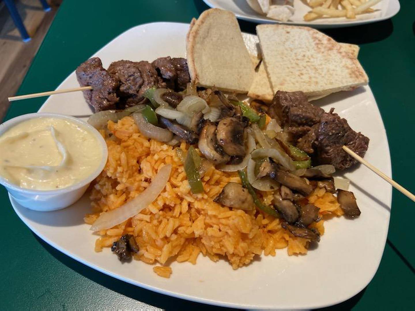 I selected the steak kabob plate ($11.99). The steak was tender and came out with four steak bites on each skewer, as well as a plate filled with rice, sauteed vegetables, pita bread and the Sticks sauce, made up of mayo, horseradish and seasoning. My fellow diner ordered the steak wrap ($8.95) served with a side of fries. The wrap itself had lettuce, tomatoes and cheese inside with a chipotle mayo dressing. It was flavorful, and my dining companion ate half but had to save the rest for later after finishing most of our appetizer.