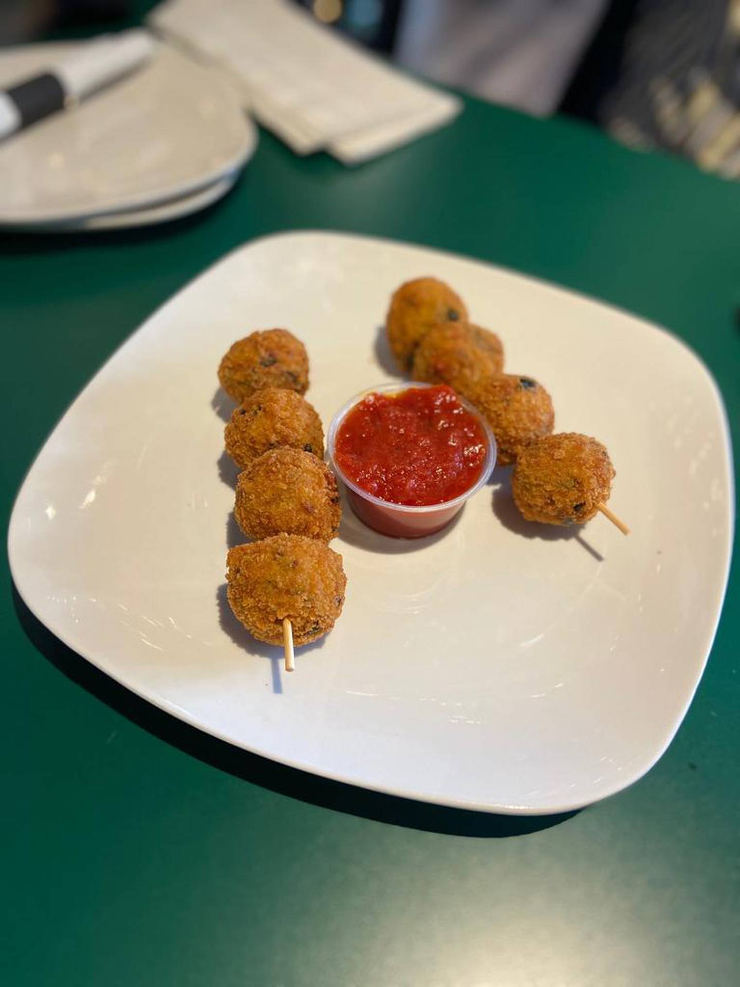 We walked in and picked a table to the side of the u-shaped bar. Private enough but still close enough to see the wide array of TVs on the wall. Our first selection, the spinach and artichoke risotto bites ($7.95), were an easy choice. (Sticks also has a spicy sausage version.) They were served on two skewers, with four risotto balls on each skewer. Between them was a cup of marinara sauce for dipping. I was able to have two, and they were delicious, but my dining companion quickly finished the other six.